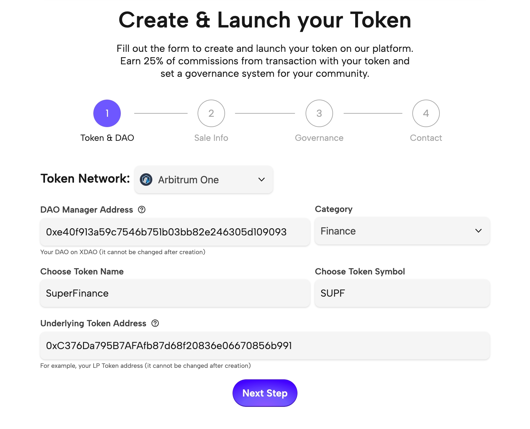 2) Select the blockchain that supports DEXDAO and matches the blockchain where you created your DAO. Enter the DAO Manager Address, which is the address of the DAO created on XDAO, choose the Category of your project, enter the Name and Token Symbol of the token to be traded on DEXDAO and enter the Underlying Token Address, which is the address of the LP token created on XDAO.