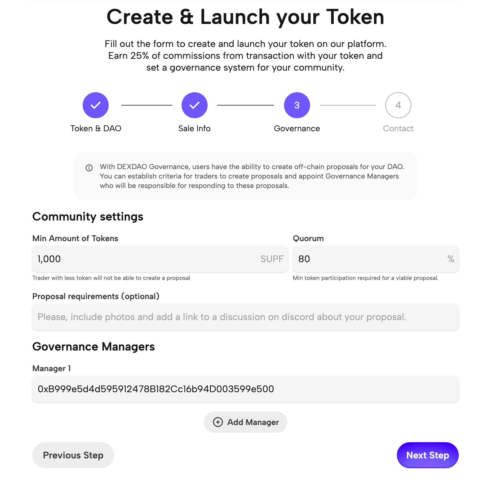 4) Specify the Minimum Amount of Tokens - the minimum number of tokens required for a trader to own in order to create a proposal. Select a Quorum - the minimum threshold of voting participants for a proposal to be submitted for approval. Enter optional Proposal requirements and select the Governance Managers who will manage the token page on DEXDAO.