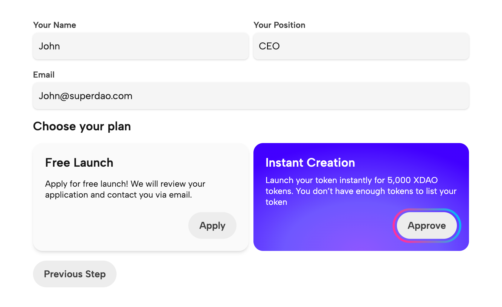 If you want to launch your token on DEXDAO as instantly, you will need 5,000 $XDAO tokens on the same blockchain that you chose at the earliest stage of the Launch Token. Click Approve to allow the smart contract to interact with the $XDAO tokens in your wallet.