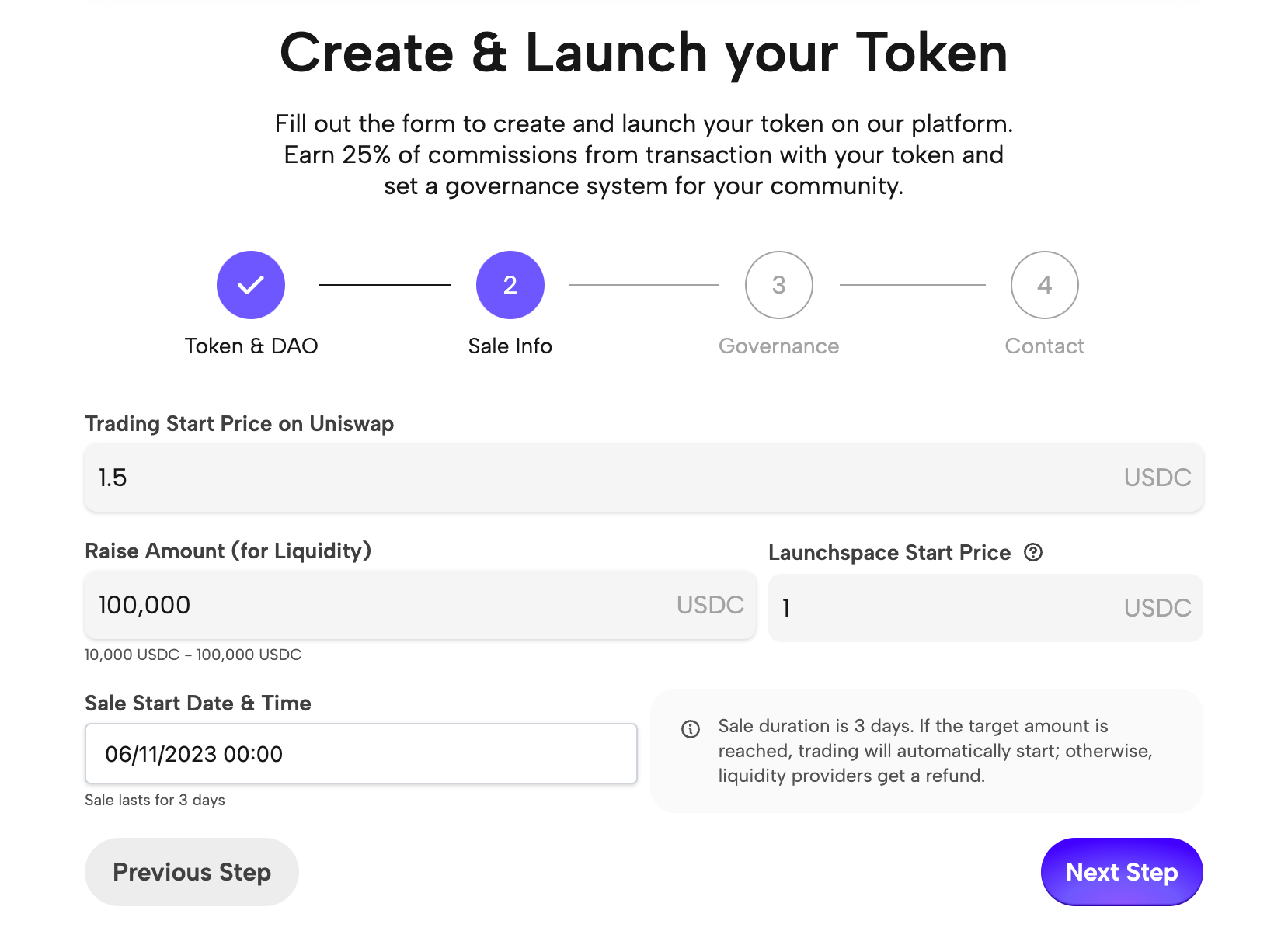 3) Enter Raise Amount - the amount that will be sent to the liquidity pool, without which trading is impossible, this amount can be in the range from 10,000 to 100,000 USDC. Enter the Sale Start Price and Sale Start Date & Time - marking the specific date and time when the liquidity raise will start, the duration of which will be strictly 3 days and must be scheduled in the future.