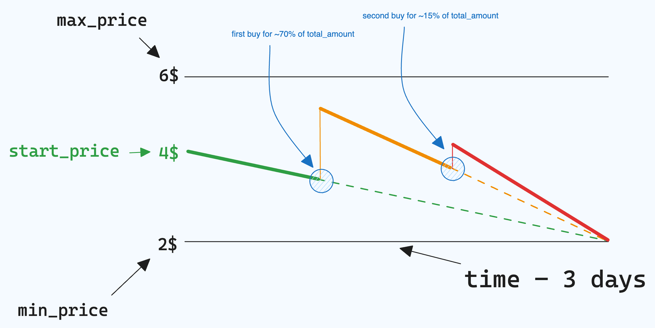 Sale price linearly moves from last price and last timestamp to min price and end timestamp until the buy is coming.