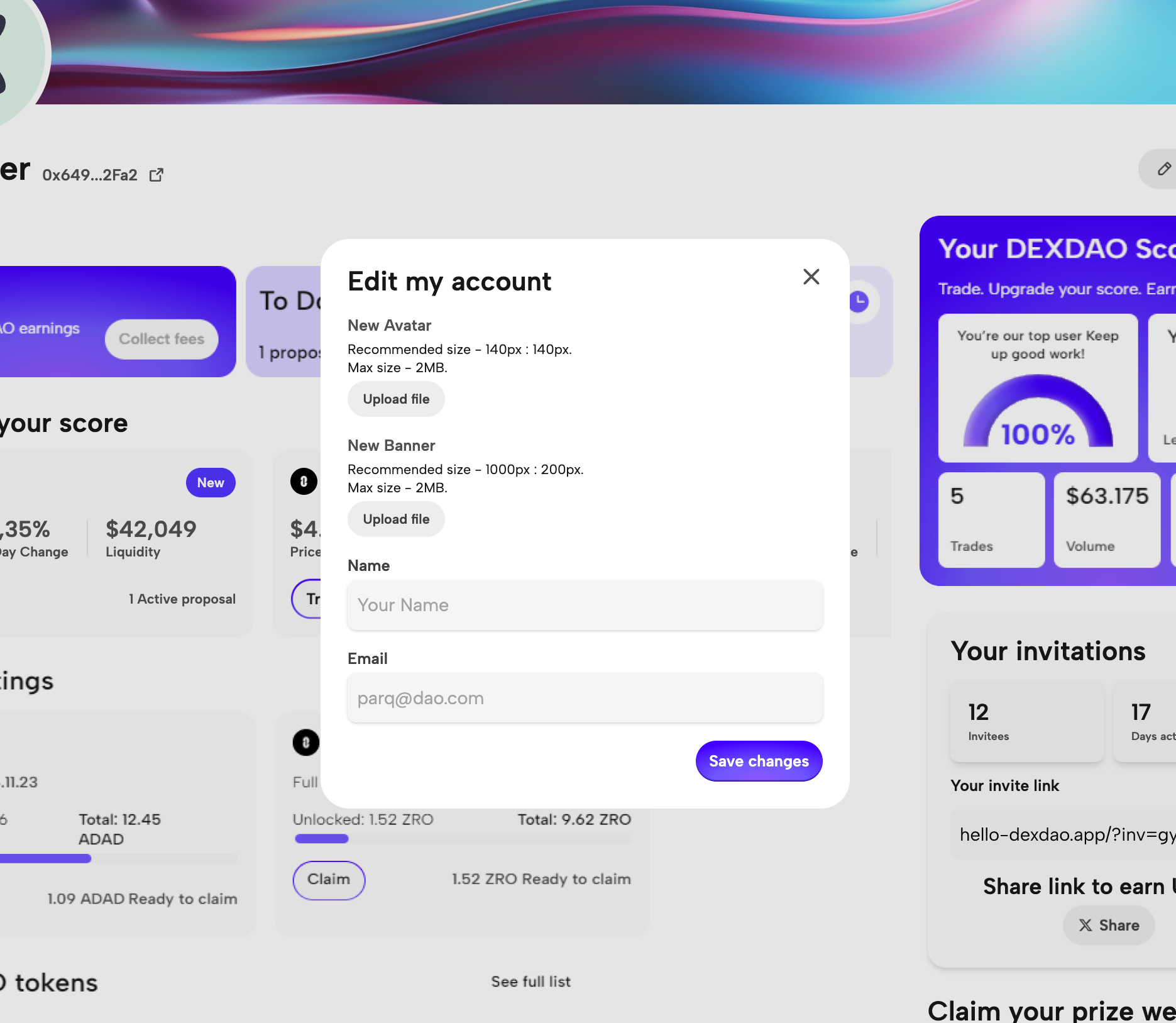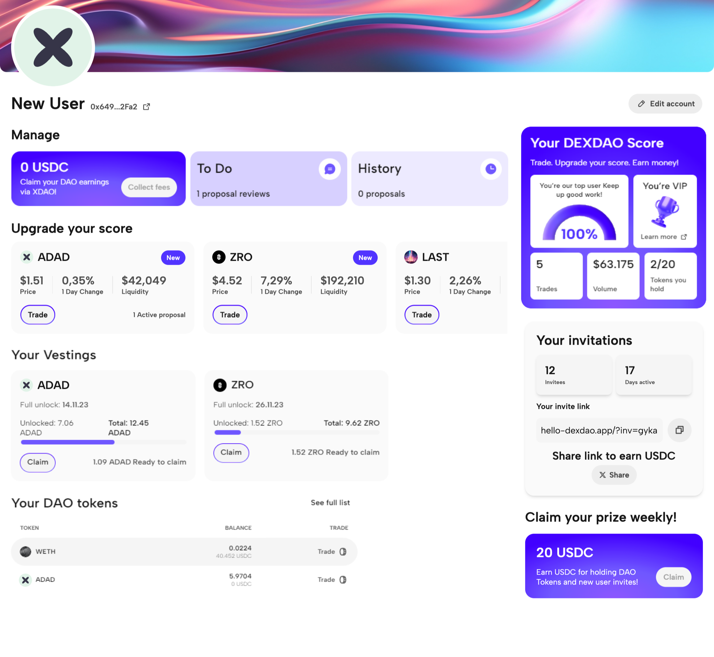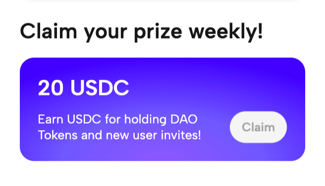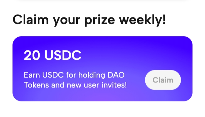 In the Claim your prize weekly! section you can collect your commission rewards for individuals who have joined and traded with DEXDAO using your invite code. Click Claim and confirm the transaction in your wallet.