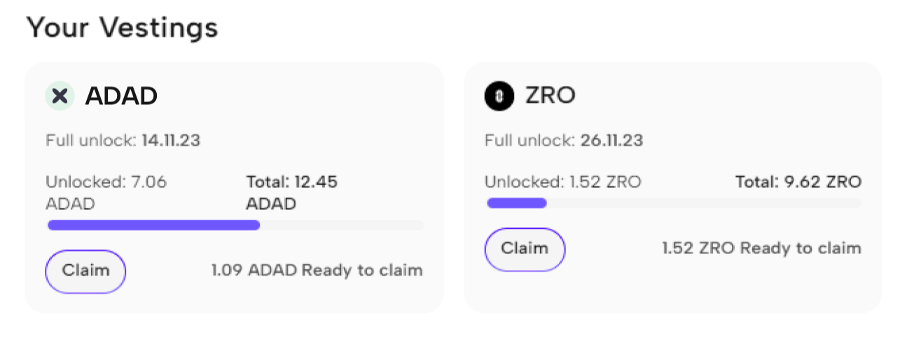 The Your Vestings section displays tokens in which you invested early in Launchspaces and were a liquidity provider, enabling you to claim those tokens. Click Claim and confirm the transaction in your wallet.