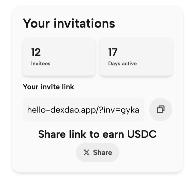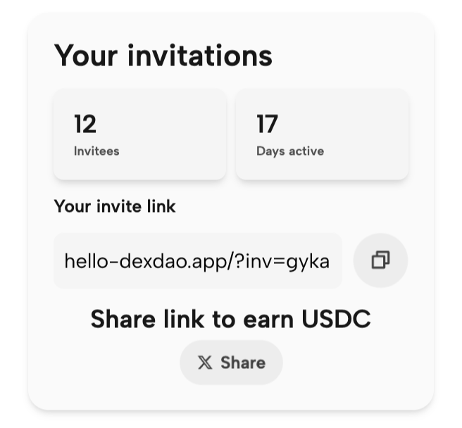 In the Your invitations section you can see the number of people who joined using your invite code, your active days on DEXDAO and your invite code.