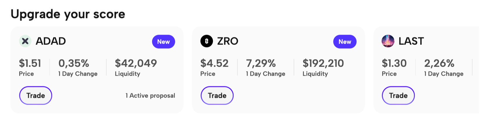 The Upgrade your score section displays tokens available for trading to increase your ranking among other users.