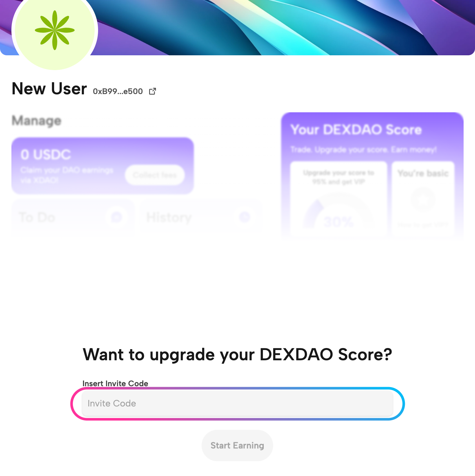 When you first connect you need to enter an invite code, as DEXDAO is an invitation-only platform.