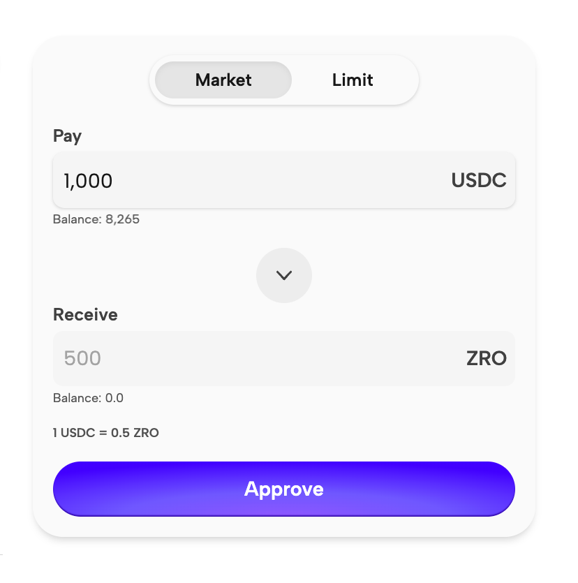 To buy tokens at the market price, enter the amount of USDC, click Approve and confirm the transaction in your wallet.