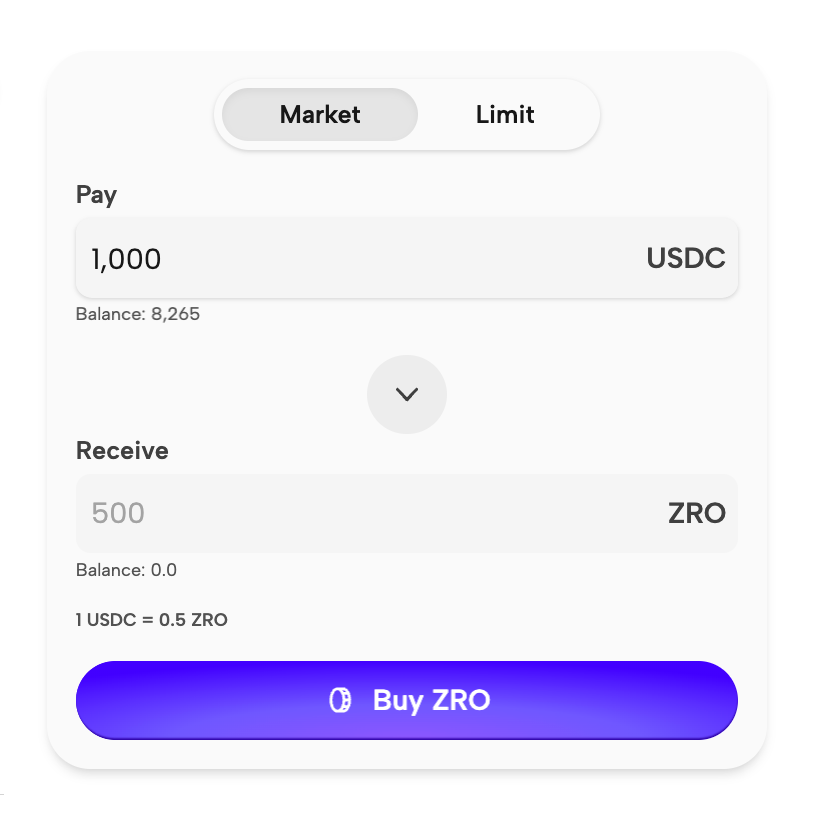 To buy tokens using limit order, select the Limit section. Enter the amount of USDC to buy, enter the buy price and select when the limit order will expire, it can be in 1 hour, 1 day or 1 week. Click Verify Order and make a signature in your wallet to submit a limit order.